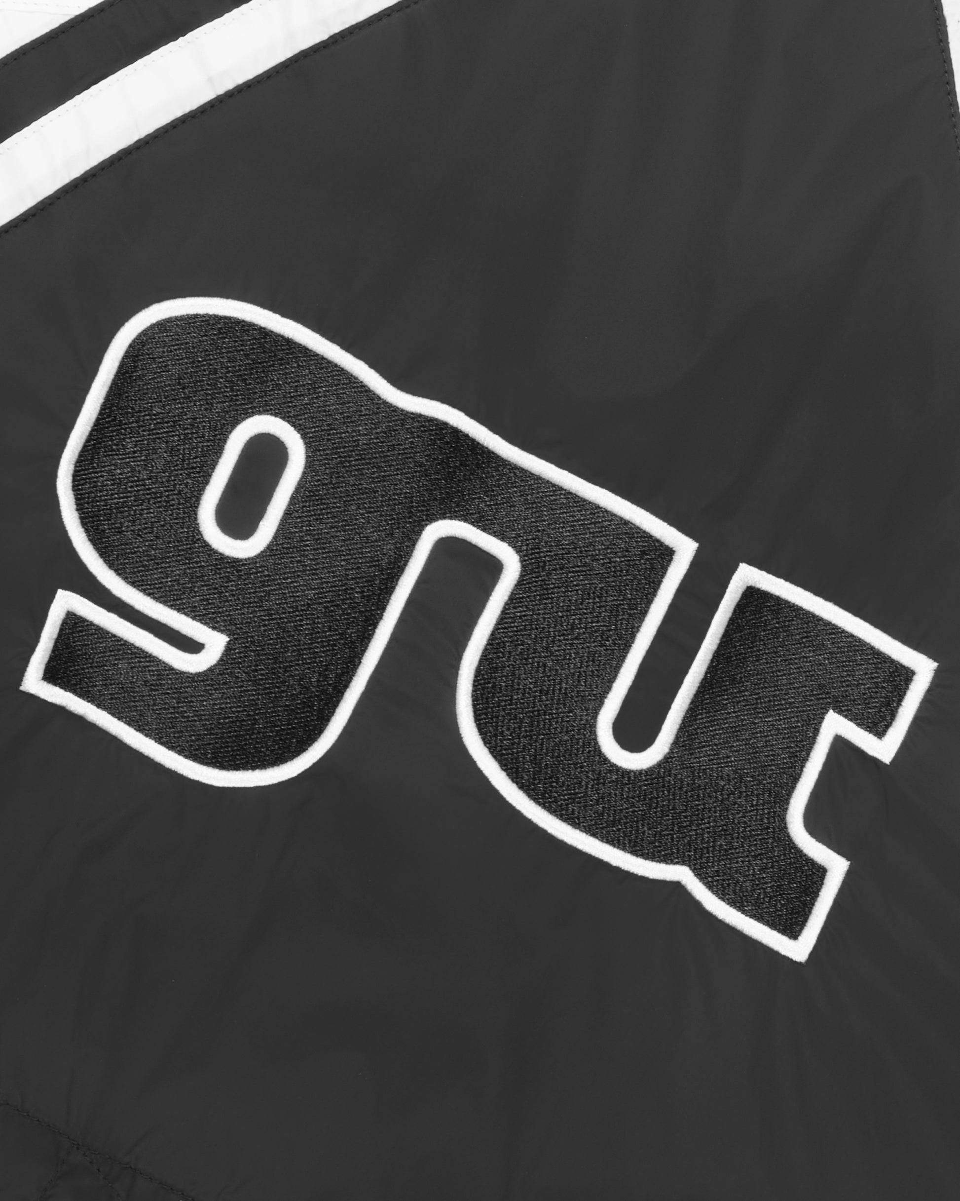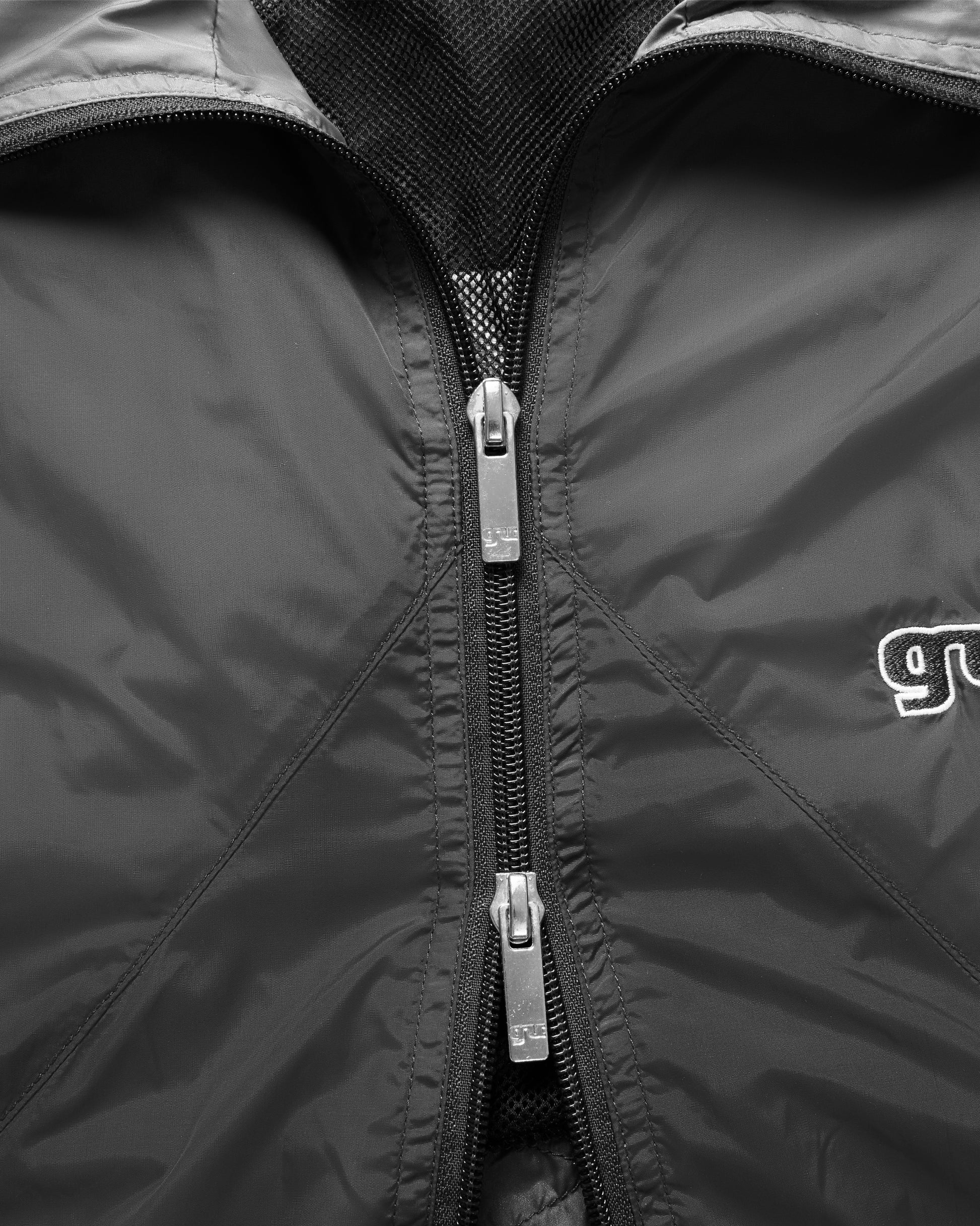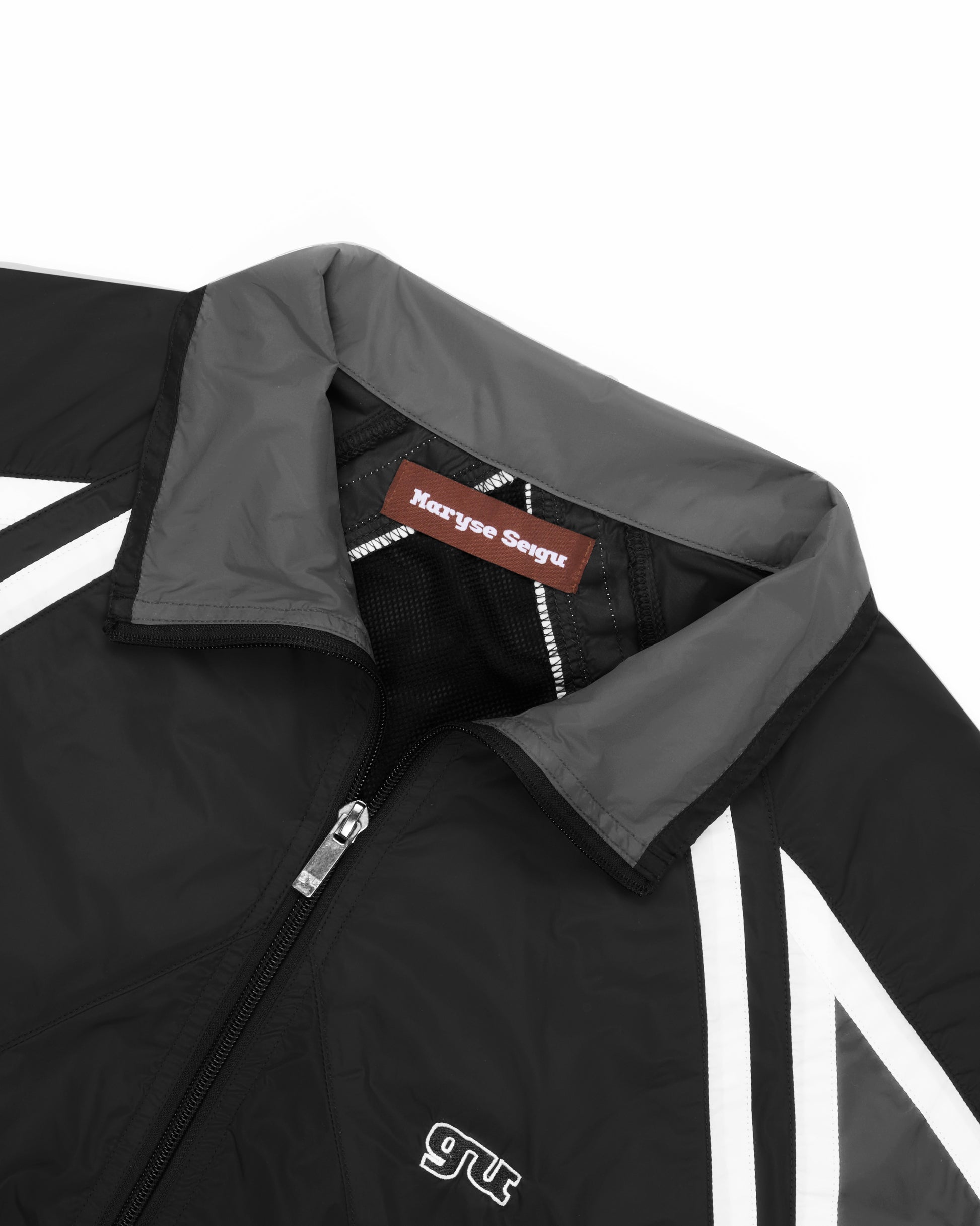 Relaxed fit shell jacket in Nylon. Features a rear vent with interior mesh panel. Black Maryse Seigu embroidered logo across the back.